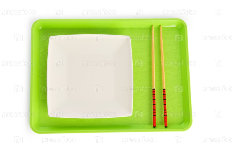 Белая тарелка,китайские палочки и разнос на белом фоне