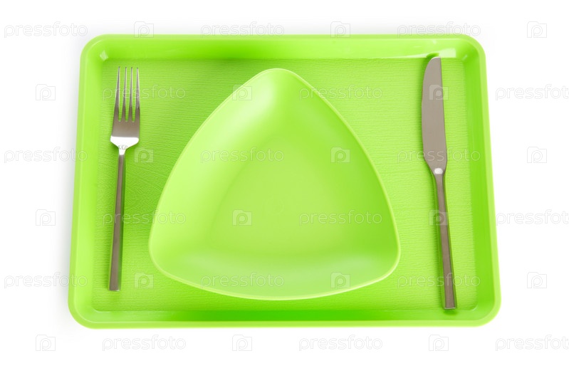 Треугольная тарелка,вилка,нож и разнос на белом фоне