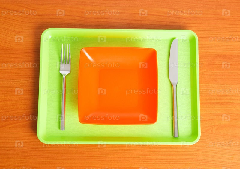 Оранжевая тарелка,вилка,нож и разнос на деревянном столе