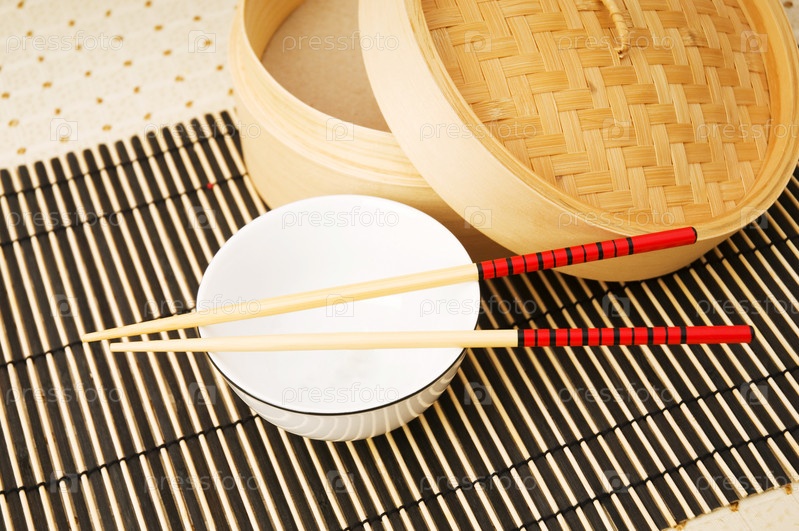 Палочки и чаша на бамбуковом коврике