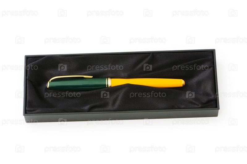 Шариковая ручка в футляре на белом фоне