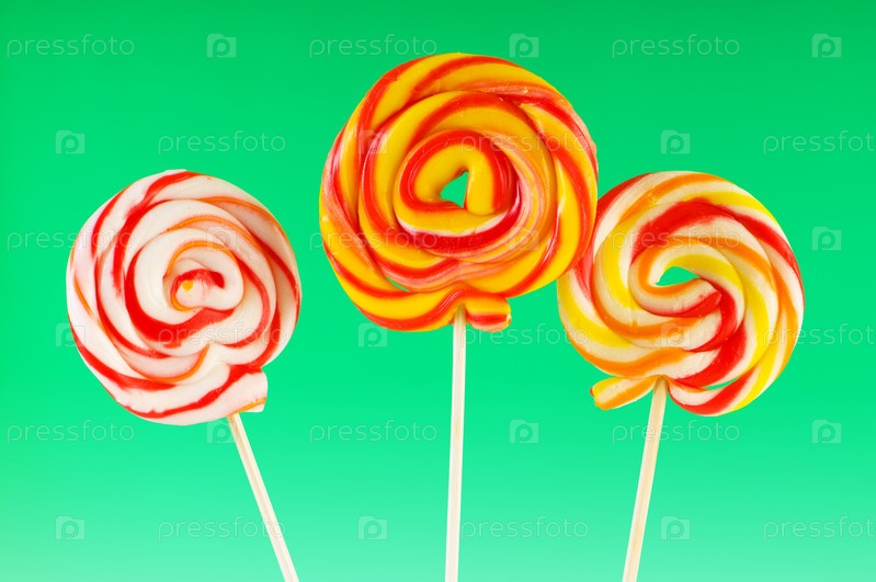 Три разноцветных леденца на зеленом фоне