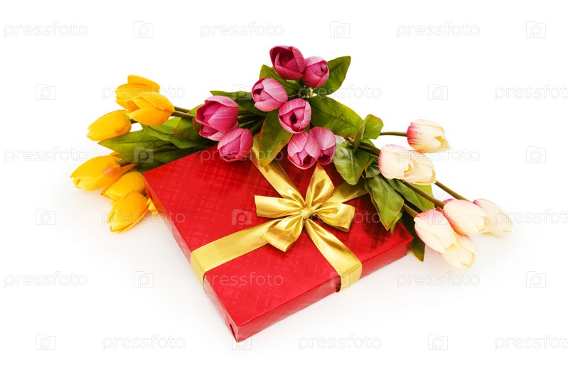 Подарочная коробка и цветы, изолированные на белом фоне