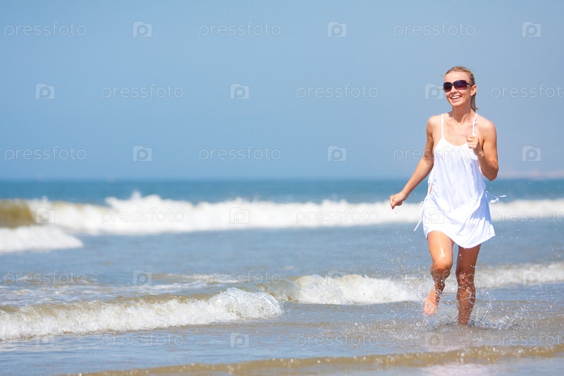 Молодая девушка бежит по морскому берегу