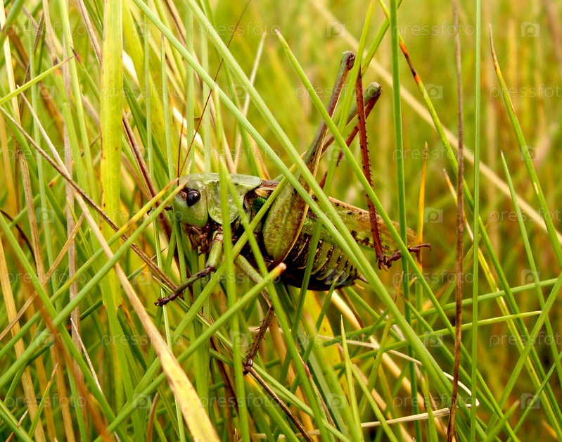 Кузнечик на фоне зеленой травы