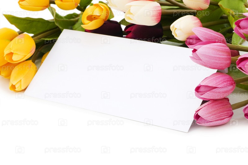 Тюльпаны и пустое сообщение, изолированное на белом