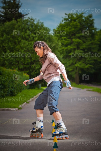 Молодая девушка катается на роликах