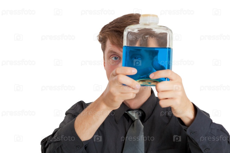 Молодой человек проверяет физические свойства жидкости в бутылке