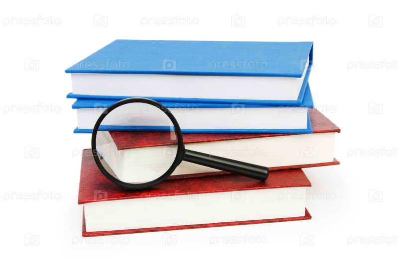 Стопка книг и увеличительное стекло на белом фоне