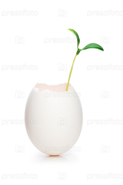 Зеленый росток в яйце на белом фоне