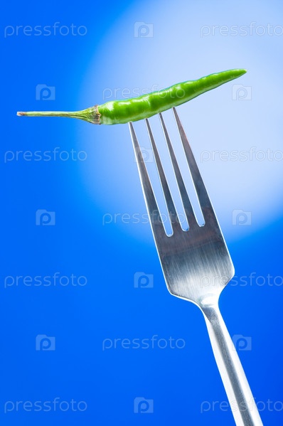 Вилка с зеленым перцем чили на голубом фоне