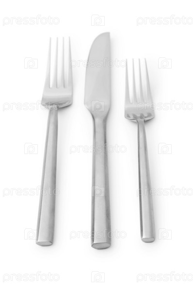Две вилки и нож на белом фоне