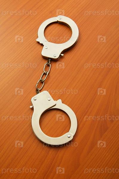 Наручники на деревянном столе крупным планом