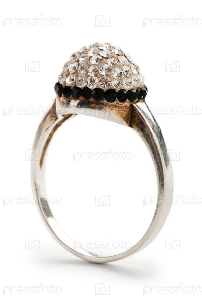 Колечко с белыми и черными стразами на белом фоне