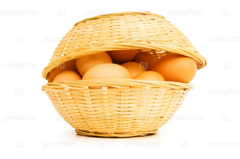 Куриные яйца в корзине на белом фоне