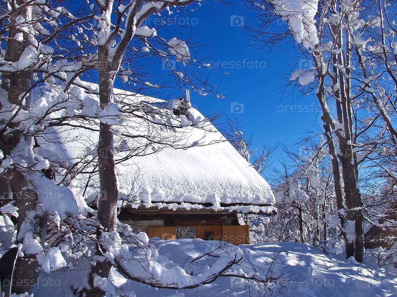 Дом в зимнем лесу на фоне гор