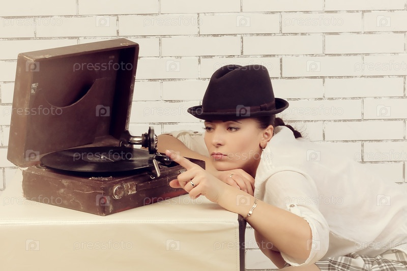 Женщина в шляпе в пол-оборота у патефона