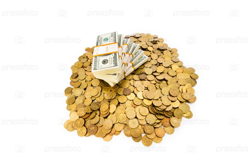 Доллары и монеты изолированы на белом фоне