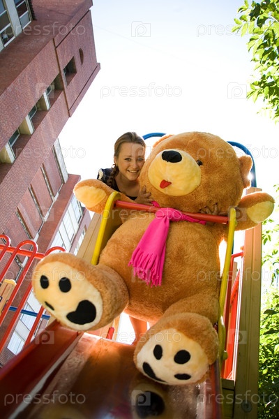 Девушка играет с медведем на детской площадке