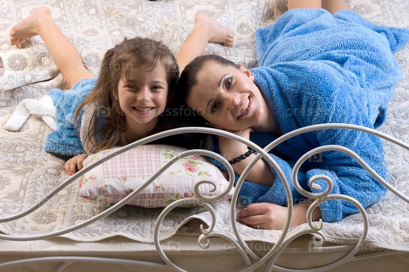 Мать и дочь лежит на кровати