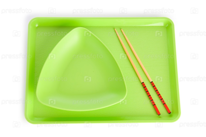 Китайские палочки и тарелка на подносе на белом фоне
