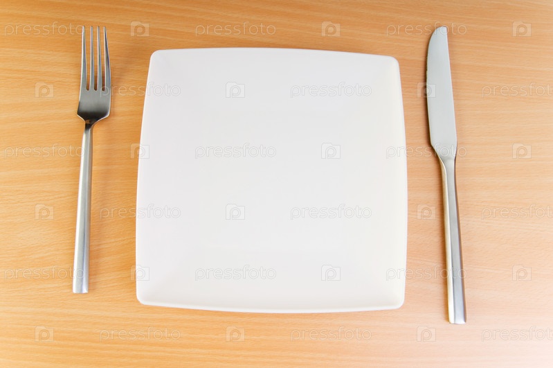 Белая квадратная тарелка, нож и вилка на деревянной поверхности