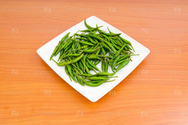 Стручки зеленого горького перца в тарелке на деревянном столе