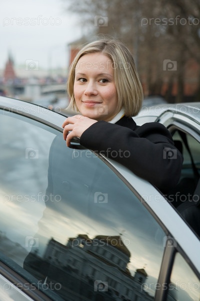 Красивая девушка стоит за открытой дверью автомобиля