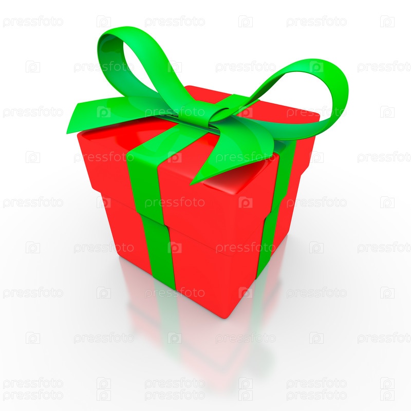 Красная подарочная коробка с зеленой лентой на белом фоне