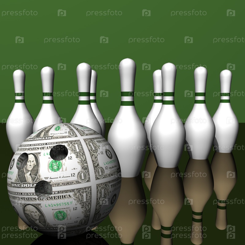 Долларовый мяч и белые кегли на зеркальной поверхности