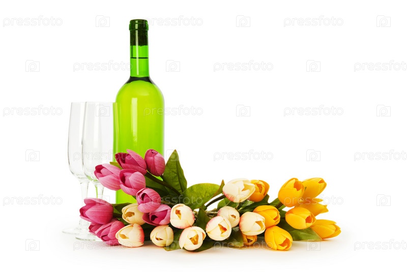 Бутылка вина, два бокала и цветы на белом фоне