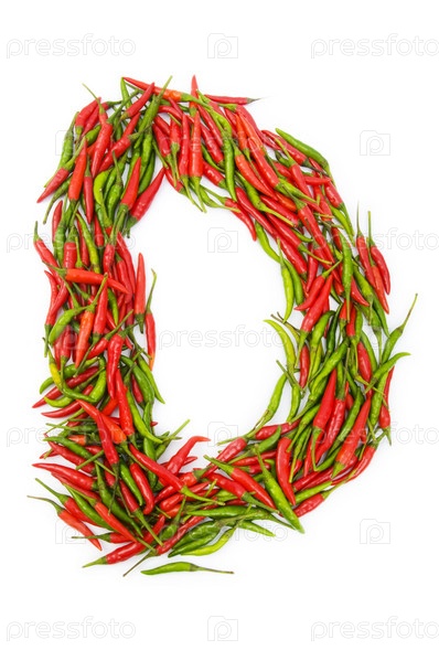 Буква 'D' из красного и зеленого перца чили на белом фоне