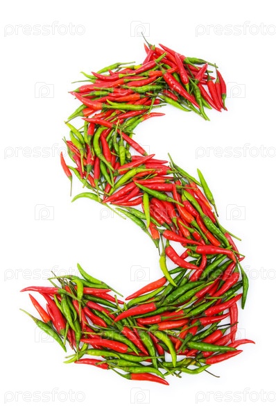 Буква 'S' из красного и зеленого перца чили на белом фоне