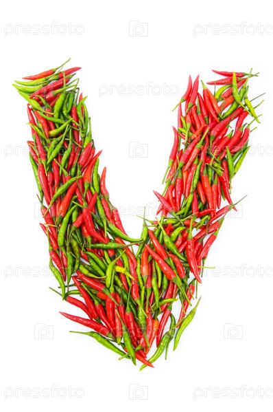 Буква 'V' из красного и зеленого перца чили на белом фоне