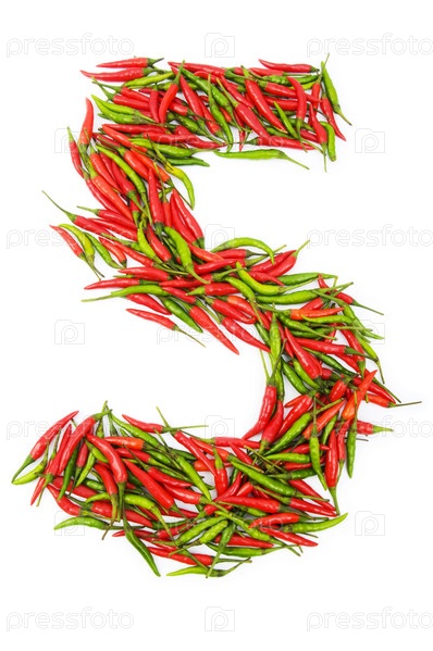 Цифра "5" из красного и зеленого перца чили на белом фоне
