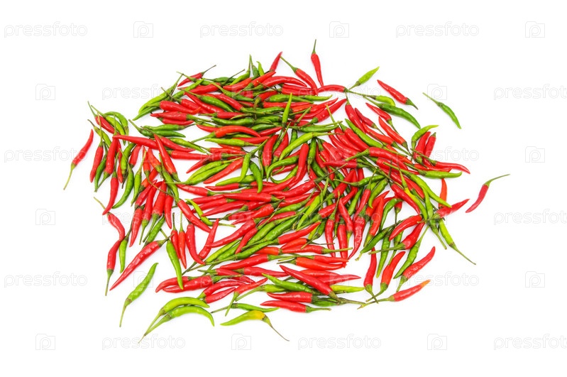 Горсть красного и зеленого перца чили на белом фоне