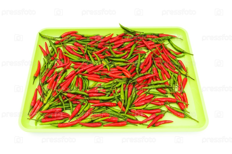 Куча красного и зеленого перца чили в тарелке на белом фоне