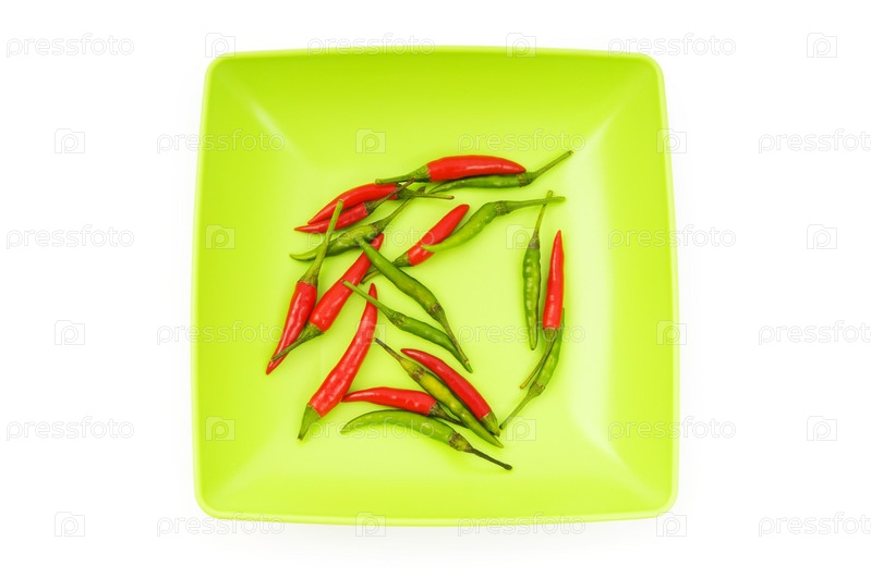 Горстка красного и зеленого перца чили в тарелке на белом фоне
