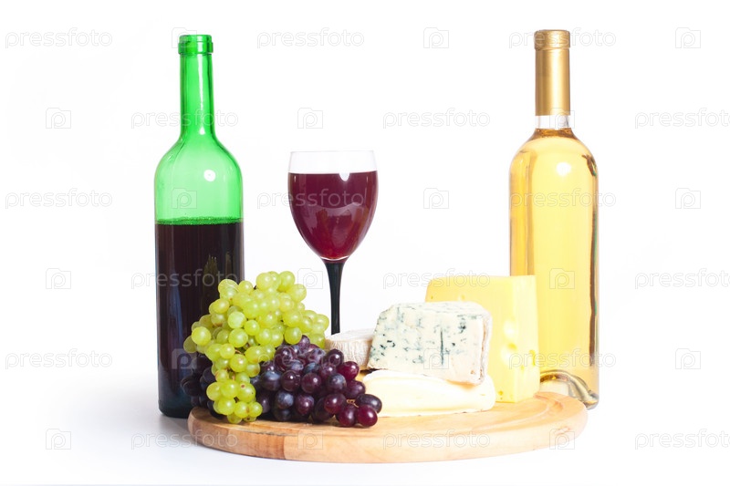 Сыр, виноград и вино на белом фоне