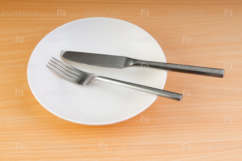 Пустая тарелка, нож и вилка
