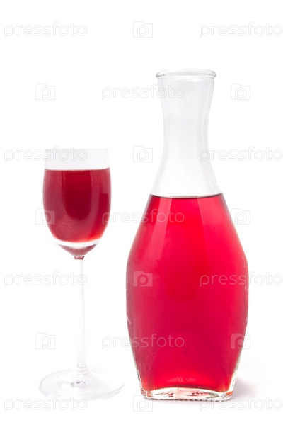 Графин и бокал с красным напитком на белом фоне
