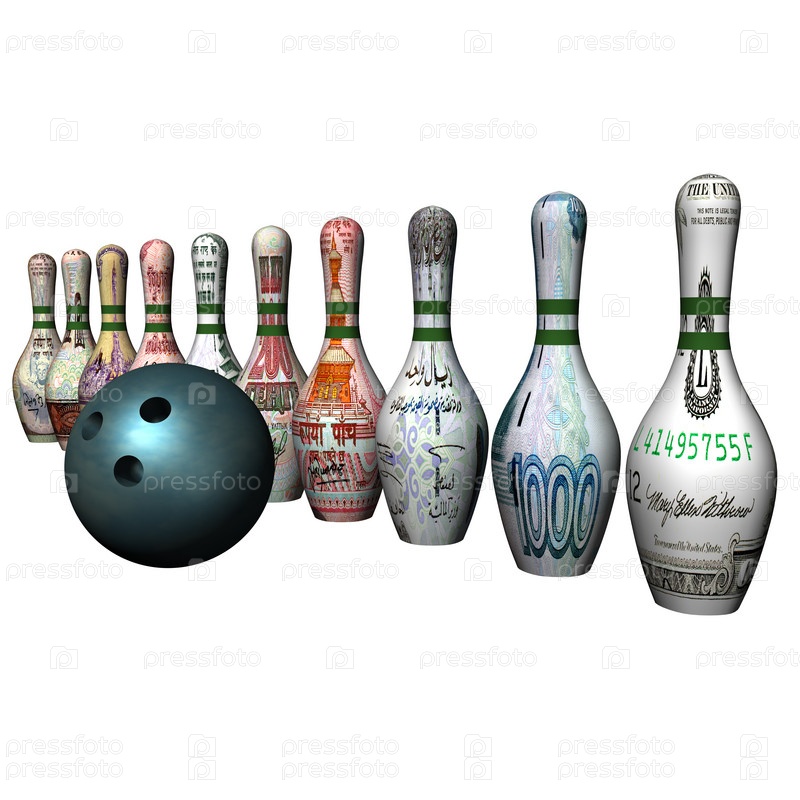 Шар для боулинга и купюры разных стран на кеглях для боулинга, белый фон