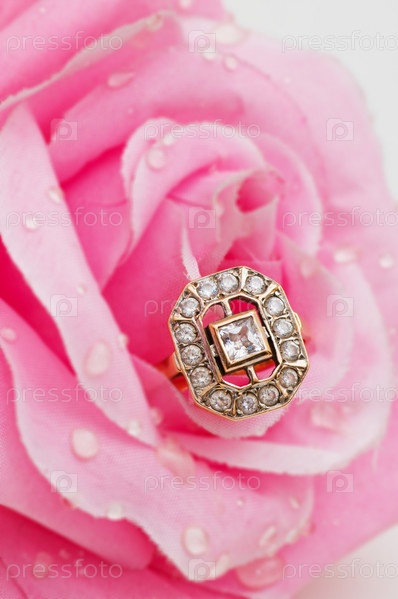 Золотое кольцо против розовой розы