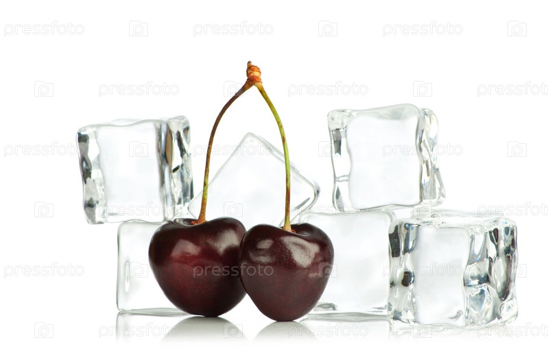 Вишня и кубики льда на белом фоне