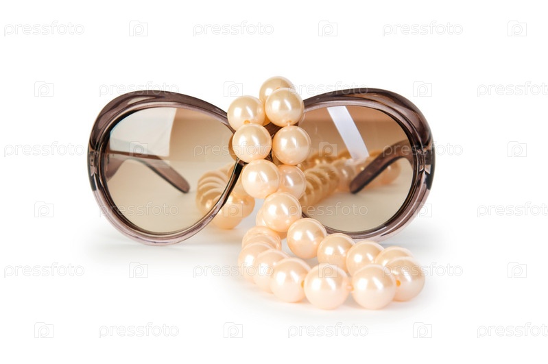 Бусы и солнцезащитные очки на белом фоне