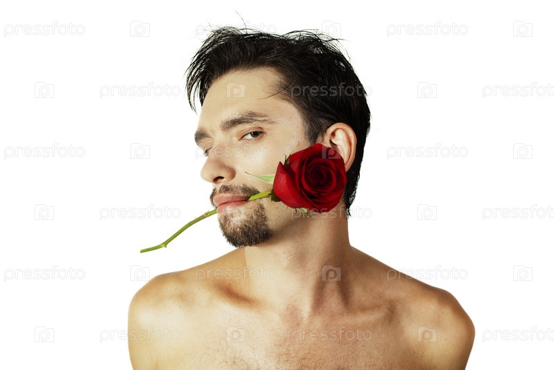 Молодой человек с розой во рту на белом фоне