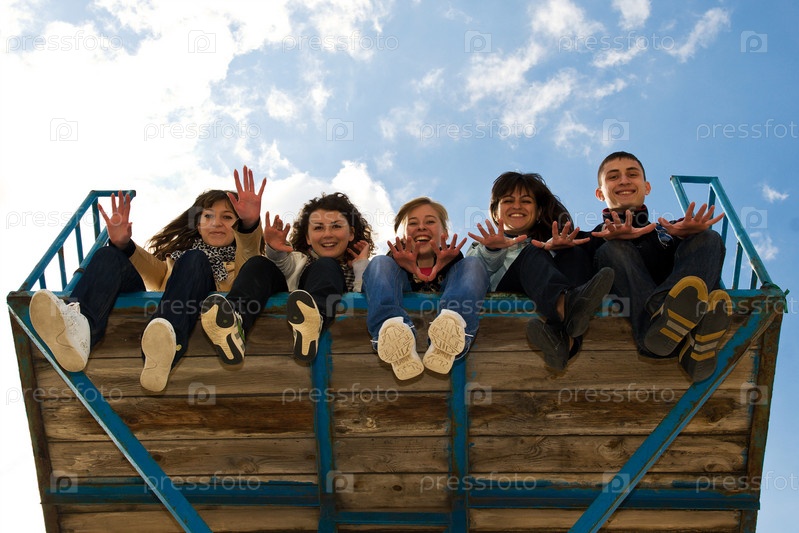 Пять подростков сидят свесив ноги вниз на фоне неба