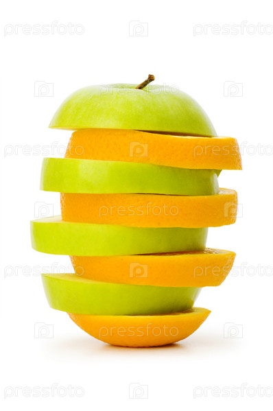 Ломтики яблока и апельсина на белом фоне