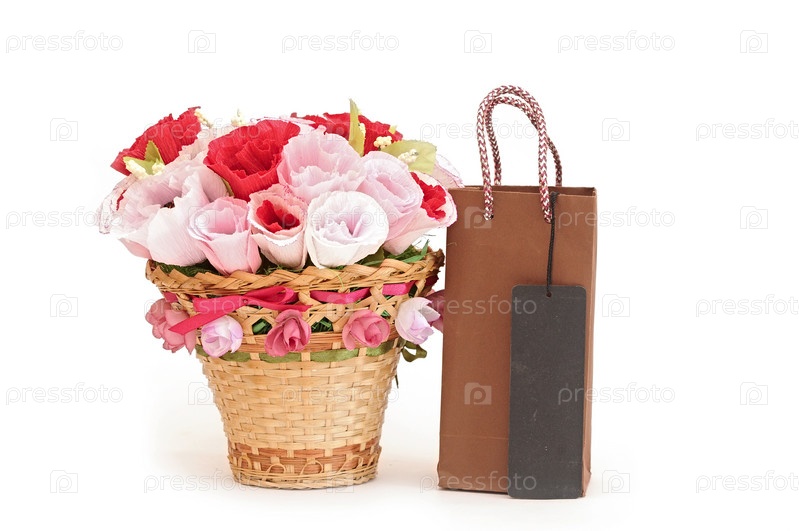 Бумажные цветы в корзине и пакет