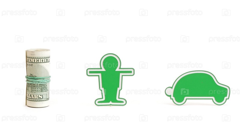 Маленький человек с пачка долларов и зеленый автомобиль, изолированные на белом фоне